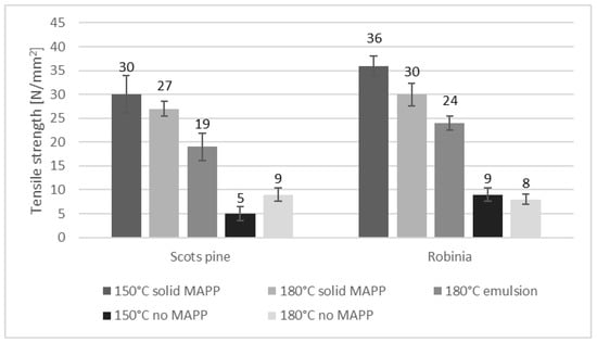 Tensile strength of composites with TMP based on Scots pine or Robinia. For comparison, tensile strength of composites with wood flour (softwood) was 41 N/mm2 including MAPP (solid) and 11 N/mm2 excluding MAPP.
