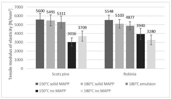 Tensile modulus of elasticity of composites with TMP based on Scots pine or Robinia. For comparison, tensile MOE of composites with wood flour (softwood) was 7169 N/mm2 including MAPP (solid) and 5826 N/mm2 excluding MAPP.