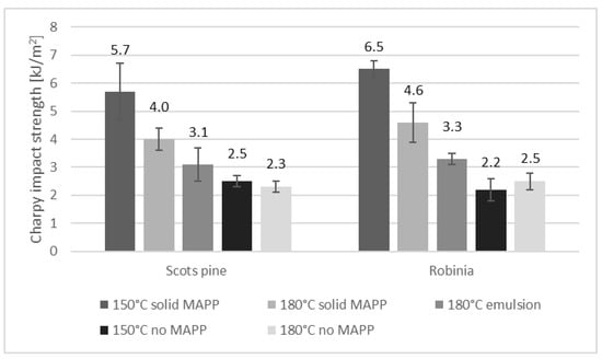 Charpy impact strength of composites with TMP based on Scots pine or Robinia. For comparison, values for composites with wood flour (softwood) were 6.9 N/mm2 including MAPP (solid) and 2.8 N/mm2 excluding MAPP.