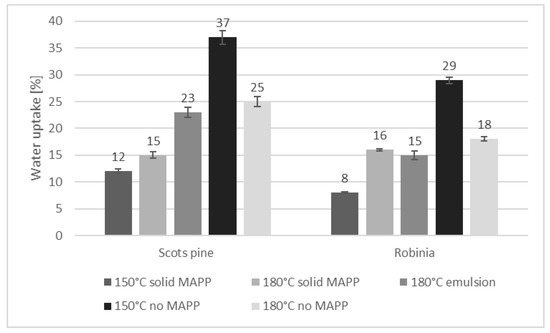 Water uptake of composites with TMP based on Scots pine or Robinia. For comparison, values for composites with wood flour (softwood) were 7% including MAPP (solid) and 31% excluding MAPP.