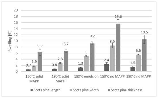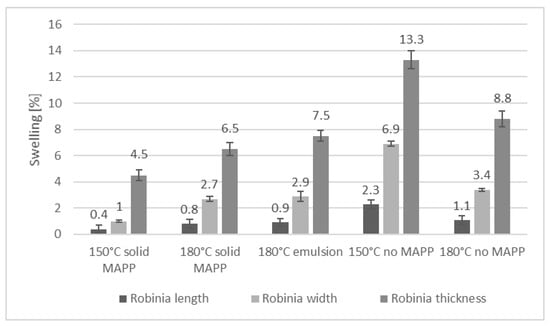 For WPC with Robinia TMP processed at 180 °C, no difference regarding water uptake during the boiling test was observed whether emulsified or solid MAPP was used (16% versus 15% water uptake; Figure 6). However, in the case of Scots pine TMP, MAPP in solid form was more effective in reducing water uptake of WPC than emulsified MAPP (15% versus 23% water uptake). Overall, the lowest water uptake of WPC made with TMP was achieved with Robinia (8%) which had been processed at 150 °C and using the solid MAPP. This value is in the same range as for WPC with commercial wood flour (7%). Swelling values after the boiling water test were also similar for WPC with Robinia TMP and wood flour and including MAPP (Figure 7); however, wood flour performed slightly better. For WPC with Robinia TMP, swelling values were 4.5% in thickness, 1.0% in width and 0.4% in length. These values were exceeded when Scots pine TMP was used (Figure 8). For both wood species, the MAPP emulsion led to higher swelling values compared to the solid MAPP. The higher defibration temperature (180 °C) resulted in lower swelling values when no MAPP was used, similar to what could be observed for water uptake.