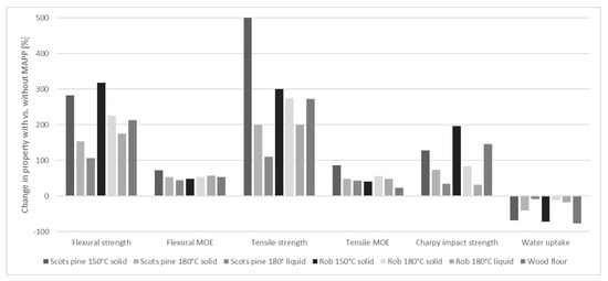 Improvement in mechanical properties and water uptake of WPC due to the use of MAPP (reference: corresponding formulations without MAPP). Solid: MAPP applied as pellets; liquid: MAPP applied as emulsion; rob: Robinia. Temperatures correspond to defibration temperatures during thermomechanical pulping.