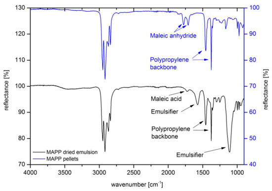 The fact that mechanical properties were improved by the application of emulsified MAPP shows that the coupling agent interacted with the TMP. However, emulsified MAPP was not as efficient as solid MAPP. It may be that the emulsifier (surfactant) used in MAPP affected the efficiency of the coupling agent or that a larger amount of MAPP is required when applied as emulsion. Figure 10 shows ATR-FTIR spectra of MAPP in solid and emulsified forms. Two large peaks at 1375 and 1458 cm−1 are visible, which represent the characteristic double peak (deformation vibrations of the CH3-groups) for the polypropylene-backbone [53] of MAPP in both solid and liquid forms. The large peak at approximately 2900 cm−1 represents C-H bonds of the PP-backbone in MAPP (C-H stretching vibrations of CH3 in the PP chain [54]) and of the emulsifier of the liquid MAPP. The emulsified MAPP was oven-dried before the spectra were taken. The emulsifier can be identified by the peak at 1100 cm−1 which is attributed to ether (C-O-C) bonds. In addition, for the emulsified MAPP, a maleic acid peak is visible at 1739 cm−1 [28]. This peak is missing for the solid MAPP. The spectra of the solid MAPP show a characteristic maleic anhydride double peak at 1746 cm−1 [28]. It appears that in the dried emulsion, the non-activated form of MAPP is present, whereas in the solid MAPP (granules), the activated form is present. The presence of water in the emulsion may lead to an opening of the anhydride ring structure. The MAPP in emulsion form is less reactive due to open ring structure compared to the solid form where the anhydride ring remains reactive. In order to be effective as a coupling agent, MAPP needs to be converted from the maleic acid form into its more reactive anhydride form. According to Felix and Gatenholm [28], the heating of MAPP at 180 °C for five minutes results in anhydride conversion. The activation of emulsified MAPP will neither be achieved during blow-line application nor during fibre drying following blow-line application because temperatures are too low (between 85 °C and 150 °C) and residence time in the dryer is only several seconds; however, activation is assumed to be accomplished during compounding. As strength properties of the composites with emulsified MAPP were improved compared to composites without MAPP, it is evident that activation did occur.