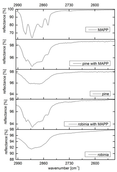 In addition to the spectra of the extract, the residue was also investigated. In the spectra of the residue, characteristic bands of the MAPP are visible; however, they are very weak. In the spectra of the Robinia wood alone (Figure 11), these are not visible. This in turn shows that a small part of the MAPP was bound to the wood. In summary, some ester links could be detected between TMP and MAPP using ATR-FTIR. Although unbound MAPP was detectable in the extract, it could be shown that some chemical bonding between the coupling agent and TMP occurred. It appears that ester links between wood components and maleic anhydride are not the key determinants for mechanical property improvement in the composites. The effectiveness of MAPP to improve the mechanical properties of WPC was attributed by Kazayawoko et al. [42] to a compatibilization effect, which is accomplished by reducing the total wood fibre surface free energy, improving the polymer matrix impregnation, improving fibre dispersion and orientation and enhancing the interfacial adhesion through mechanical interlocking. Qiu et al. [56] showed that the efficiency of MAPP could be significantly improved when cellulose fibres were pre-treated with 1,6-diisocyanatohexane. Through the reaction of the free superficial hydroxyl groups of cellulose and the NCO group of diisocyanate, the polarity and hydrophilicity of cellulose fibre was reduced, and therefore the compatibility of the cellulose fibres and PP matrix was improved. Due to the imidization reaction of the NCO group and the anhydride group of MAPP, more MAPP chains could be attached to the cellulose fibres due to better accessibility of reactive sites.