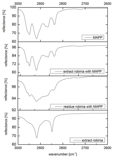 To determine if the MAPP had reacted with the fibres (covalent bonding), the treated fibres were extracted using xylene to remove any unbound MAPP, and further FTIR spectra were taken (Figure 12). Figure 12 shows the results for extracts of Robinia fibres between 3000 and 2600 cm−1. It can be seen that the spectra for the liquid MAPP (freeze-dried) and the extract of the treated fibres are almost identical, in contrast to the spectra of the untreated Robinia extract (bottom of Figure 12). This indicates that under the conditions applied, at least part of the MAPP had not chemically reacted with the fibres. As explained above, this could be due to the presence of the maleic acid form of the coupling agent. Carlborn and Matuana [55] modified wood particles with MAPP through a continuous reactive extrusion process and reported that under the conditions of their study, esterification occurred. Since they did not use a MAPP emulsion but MAPP in solid form, it can be expected that the more reactive anhydride was present. Unreacted maleated polyolefins were removed with a 24-h Soxhlet extraction. Very little difference in the spectra of the modified wood particles after a first and second extraction was found in their study, which provided evidence that the maleated polyolefins were chemically bonded to the wood particles.