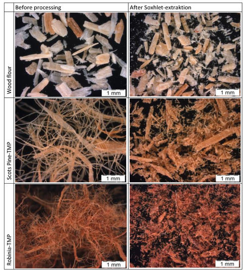 After agglomeration in the heating-cooling mixer and profile extrusion, the TMP was severely degraded and a large part of the material lost its fibrous shape (Figure 13, right). The Robinia TMP before and after processing was of darker colour due to the intensely coloured heartwood. The softwood particles retained their shape during processing more than the fibres did since they are based on ground solid wood and did not experience any defibrillation under thermal exposure, which may increase their resistance against deformation during compounding and extrusion.