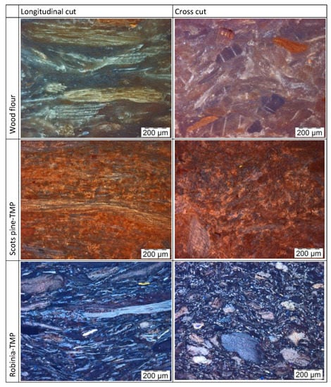 Figure 13 shows the differences in Scots pine and Robinia TMP before processing, which are partially due to their anatomical composition. Scots pine has relatively long fibres (tracheids) of up to 3.1 mm length and a fibre-length/diameter ratio of 70–103 (calculated based on Wagenführ [48]). Robinia has relatively short fibres (so-called libriform fibres) of up to only 1 mm length. However, the L/D ratio of the Robinia fibres is 112 and therefore higher. It is not the particle length which affects strength properties but rather the length-to-diameter (L/D) ratio [5]. This means that the smaller the fibre diameter, the shorter the fibre length may be to accomplish a reinforcement (critical fibre length [8]).