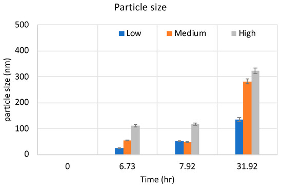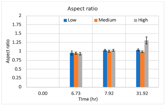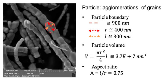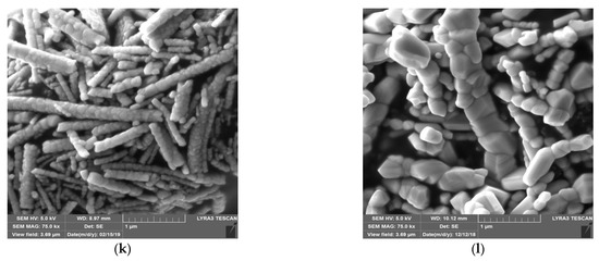 However, the aspect ratios of the particles, which is the particle size in the longitudinal direction divided by the size in the radial direction, for all calcined samples were almost always equal to one (except in high-concentration sample soaked for 24 h), indicating that the growth rate of the particles in the radial and longitudinal direction was similar (Figure 7).