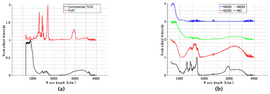 FTIR peak information for the (a) raw material, namely TiO2 and PVP, (b) as-spun fiber after calcination. (The number after the M stands for the soaking temperature with unit °C.)