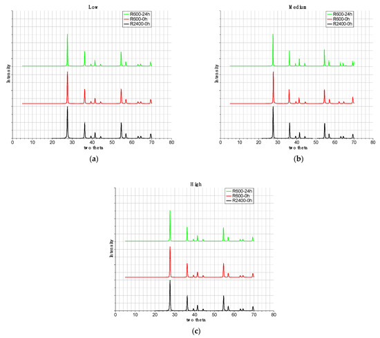 X-ray diffraction with normalized peak intensity of TiO2 fiber samples with formula (a) low, (b) medium, and (c) high.