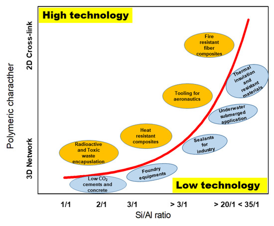 Polymeric character in geopolymers as a function of Si/Al ratio. From low to high technological applications.