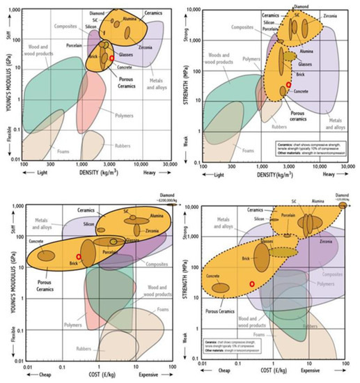 Schematic representation of Young’s modulus and strength as a function of density and cost for various materials (geopolymer is marked in red for comparison). Reprinted from http://www-materials.eng.cam.ac.uk/mpsite/interactive_charts/default.html. Last accessed 16 February 2021.