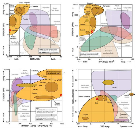 Schematic representation of strength as a function of elongation, toughness, and maximum service temperature, and the cost of recycled fraction for the various materials (geopolymer is marked in red for comparison). Reprinted from http://www-materials.eng.cam.ac.uk/mpsite/interactive_charts/default.html. Last accessed 16 February 2021.