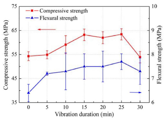 Compressive strength and flexural strength of the geopolymer matrix as the function of the vibration time of mixing. Reprinted from [16] with permission from Elsevier.