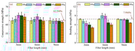 Compressive (a) and bending (b) strength of geopolymer as the function of fiber length of E-glass fiber at various volume fractions. Reprinted from [16] with permission from Elsevier.