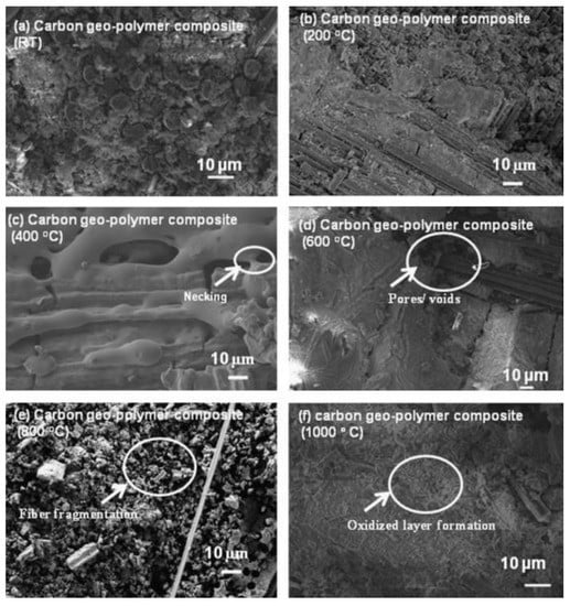 Figure 9a,f shows the carbon fiber reinforcement in the geopolymer matrix at RT and their microstructural reinforcement at various temperatures until 1000 °C for a definite period. Similarly, the microstructural evolution of E-glass and basalt fiber-reinforced geopolymer matrices are reported in Figure 10 and Figure 11.