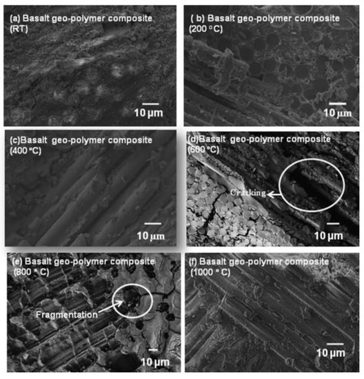 Microstructure evolution of (a) E-glass fiber-reinforced geopolymer composite (FRGC) at room temperature (RT) and (b–f) sintered at various temperatures from 200–1000 °C. Reprinted from [2] with permission from Elsevier.
