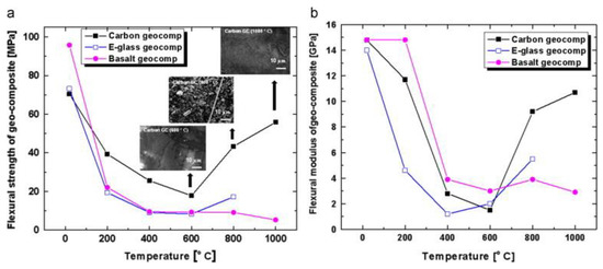Flexural strength (a) and modulus (b) of carbon, E-glass, and basalt fiber-reinforced geopolymer composite (FRGC) versus at various sintered temperatures. Reprinted from [2] with permission from Elsevier.