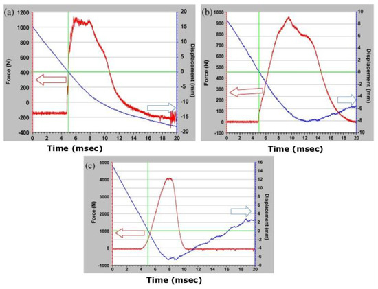 Force and displacement versus time for the (a) carbon, (b) E-glass, and (c) basalt fiber reinforced geopolymer composite. Reprinted from [5] with permission from Elsevier.