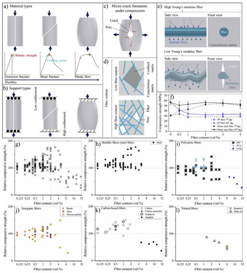 (a) Material strength in the various condition of fracture (b) Compression as the function of defor-mation (c) Crack formation mechanism (d) influence of fiber content on structure of the composites; (e) fiber performance under compression; (f) development of compressive strength of FRGC over time; the influence of fiber content (g) relative compressive strength as the function of fiber content for all fiber types, (h) steel fibers, (i) synthetic polymeric fibers, (j) inorganic fibers, (k) carbon-based fibers, and (l) natural polymeric fibers. Reprinted from [27] with permission of Elsevier.