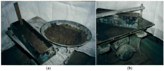 Preparing BFM specimens: (a) laying in metal molds; (b) Form compacting within the first 30 s of vibration.