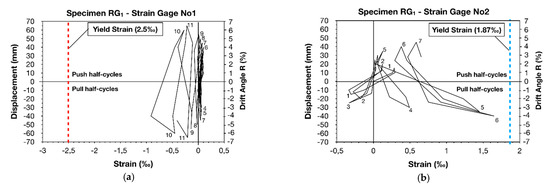 For this reason, electrical resistant strain gages were attached to the lap-spliced bars of the column specimens, as well as to the ties of the thin high-strength RC jackets of RG1 and RG2, to allow the monitoring of steel stain variations during the earthquake-type loading and ascertain if yielding of the bars was achieved. The exact location of the strain gages is illustrated in Figure 10, while in Figure 11 and Figure 12 the plots of the load point displacement-versus-strain of reinforcement and the plots of maximum steel strain per cycle of loading are illustrated, respectively. Based on the strain analysis (see Figure 10, Figure 11 and Figure 12), it was concluded that the continuously increasing strain values of the lap-spliced reinforcement of strengthened specimen RG1 resulted from both the confinement offered by the additional ties and from the high-strength concrete of the jacket, which replaced the concrete of low compression strength in the lap splice region. This dual contribution of the jacket substantially increased the bond stress between the bars and the concrete along the inadequate lap splice length and allowed for a satisfactory load transfer between the lap-spliced reinforcement. Therefore, yielding of reinforcement ( 1.87‰) was eventually achieved (see Figure 11b,c and Figure 12). Moreover, it was clearly demonstrated that only minor steel strain (significantly lower than the yielding strain 2.50‰) was developed in the ties of the RC jacket (see Figure 11a,d and Figure 12). The latter was further substantiated by the failure mode of specimen RG1, which did not include any damage to the thin RC jacket (no increase in volume of the core concrete or loss of the concrete cover were observed). Consequently, it was evinced that the strengthened specimen RG1 exhibited a ductile dissipating hysteresis response due to the satisfactory performance of the thin high-strength RC jacket. The same is also true for specimen RG2. The CFRP-strengthened column, FS2, showed increasing strain values of the lap-spliced reinforcement during the consecutive cycles of loading. This continuous increase in steel strain values up to the fifth cycle of loading indicates an absence of bar slipping for a drift angle ratio of up to 3.57% [36]. However, the strain values remained lower than steel yielding strain 1.87‰ (see Figure 11e). Thus, from the measurements of the strain gages, it was demonstrated that the confinement provided by the CFRP jacket was insufficient to allow yielding of the lap-spliced bars. The latter is attributed to the unexpected failure of the jacket, which, in turn, caused loss of the confinement provided to the lap splice region, while triggering brittle bond-slip failure and slipping of the bars.