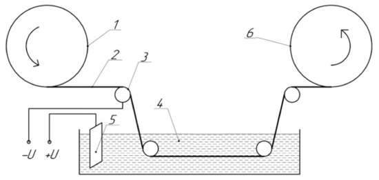From donating coil (1), carbon fiber yarn (2) passes through reaction medium tank (4). The length of the tank was 150 mm. In this case, a negative potential was applied to the carbon fibers using a conductive graphite roller (3). In addition, a graphite electrode (5) with a positive potential equal in magnitude to the potential of the fibers was immersed in the reaction medium. The immersion time of the fibers in the medium was from 0.01 to 2 min. After passing through the tank, the fibers were wound on a receiving spool (6). After the deposition, the fibers were dried for 24 h under normal conditions. During the deposition, a pulsed DC source with a built-in voltmeter and an ammeter was used.