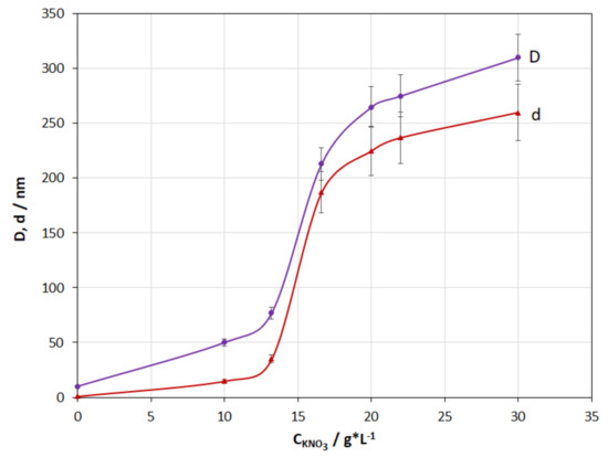 Dependence of the average coating thickness (D) and average particle size (d) on the salt concentration (CKNO3) in the reaction medium.