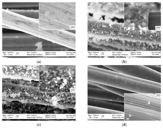 Surface of the coated carbon fiber formed in the reaction medium with KNO3 salt concentration from 0 to 30 g/L: (a) 0 g/L, (b) 10 g/L, (c) 20 g/L, (d) 30 g/L.
