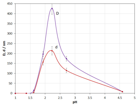 Dependence of the average coating thickness (D) and average particle size (d) on the pH of the reaction medium.