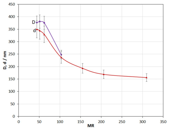 Dependence of the average coating thickness (D) and average particle size (d) on the molar ratio H2O/TEOS (MR) in the reaction medium.