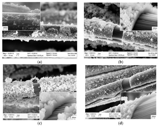 Figure 7 shows the SEM images of coated carbon fibers obtained in the reaction medium with the parameters indicated in Table 3.