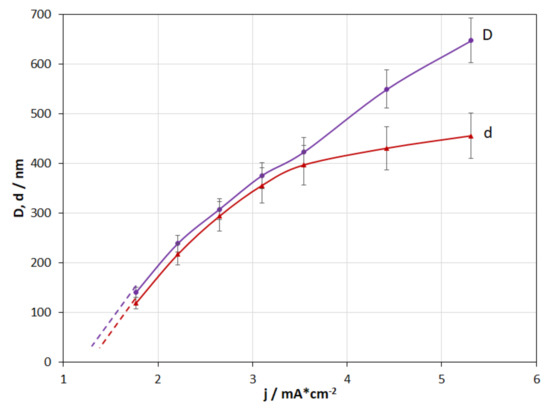 Dependence of the average coating thickness (D) and average particle size (d) on the current density (j).