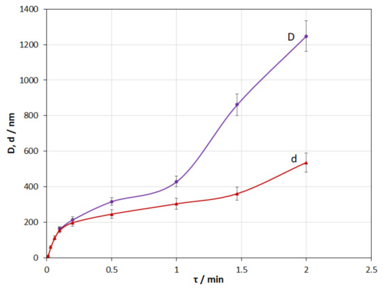 Dependence of the average coating thickness (D) and average particle size (d) on the deposition time (τ). in case of decimal numbers.