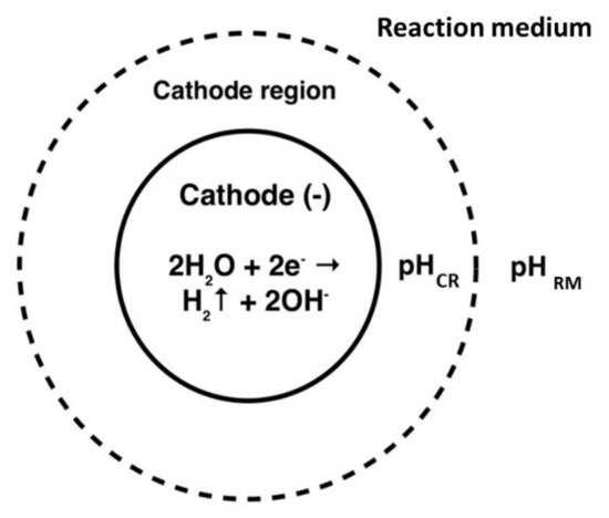 It was stated above that a pH jump of the medium occurs on the surface of the electrodes. The OH-groups are formed at the cathode due to hydrogen reduction from water and, as a result, the pH of the medium increases in the cathode region (Figure 15). On the contrary, H+ cations are formed at the anode during water oxidation, which lowers the pH of the medium in the anode region.
