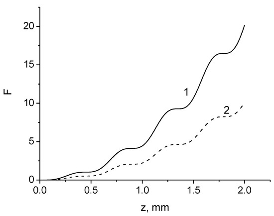 In Figure 3 the values as a function of the distance z are presented for meridional and sagittal rays. It can be seen that the increase in this value is accompanied by small fluctuations. The degree of polarization decreases quadratically with the increasing distance. Depolarization increases with an increase in the displacement of the axis or the inclination of the beam to the axis of the waveguide. The decrease in the degree of polarization is accompanied by small fluctuations. Note that Equation (28) is valid only for distances z ≤ z0, where the distance z0 is determined by the accuracy of the solution of Equation (8). In our case, this distance is equal to
