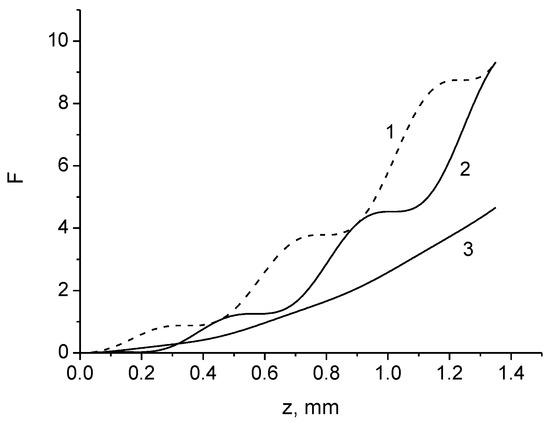 The values as a function of distance for x0 = 15 μm; curve 1—sagittal ray with positive helicity (); curve 2—sagittal ray with negative helicity (); curve 3—meridional ray.