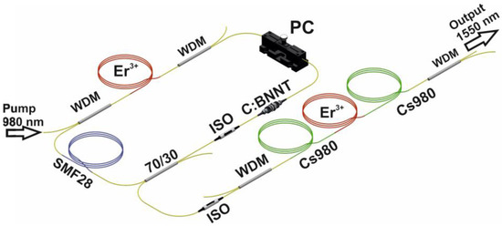 The experimental setup of the ML fiber laser is shown in Figure 1. The SWCNTs: BNNTs film was used as a slow passive SA inserted into a module formed by two FC/APC connectors. The SA used in the work has a response time of up to 0.5 ps and a modulation depth of about 12% (at 1550 nm), which is sufficient for the reliable start-up of USP generation [15]. Unsaturated losses of the SA used in the work were about 29.2 ± 0.5% [16]. To provide unidirectional generation, a commercially available polarization insensitive optical isolator (ISO) was used. To adjust the mode locking, a polarization controller (PC) was included into the cavity on one side of the ISO. The all-fiber ring cavity was formed by a 7.07 m active erbium-doped fiber (Lucent HE980) with a low signal core absorption of ~3 dB/m at the pump wavelength, with dispersion of D ~−54.6 ps/(nm∙km) at 1550 nm and 18.5 m SMF-28 fiber (Corning Corp.) with dispersion of D ~17.4 ps/(nm∙km) at 1550 nm. The lengths of the fibers were calculated to shift the total net-cavity GVD at 1550 nm into the slightly positive region and to ensure the chirped-pulse generation regime. The total net-cavity β2 is estimated to be +0.12 ps2 at 1550 nm.