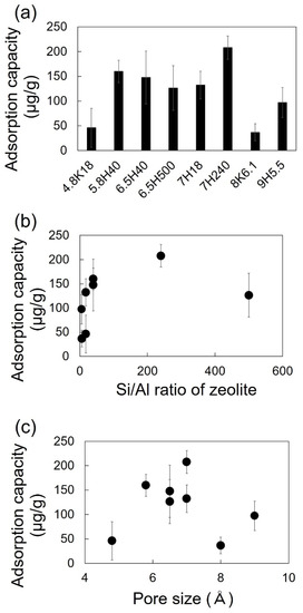 (a) The IS adsorption capacities of various zeolites after the 24 h adsorption test. (b) The IS adsorption capacities with the Si/Al ratios of each zeolite. The high Si/Al ratio indicates the large hydrophobicity of zeolite. (c) The IS adsorption capacities with the pore sizes of each zeolite. (n = 3).