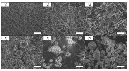 The plain EVOH nanofiber mesh and 7H240 zeolite/EVOH nanofiber mesh fabricated via electrospinning were observed using SEM (Figure 2a). The EVOH nanofibers were smooth and exhibited no bead structure without the added zeolite. After the incorporation of zeolite at 10 and 20 wt%, well-dispersed zeolite particles were observed (Figure 2b,c). However, the zeolite particles began to aggregate at concentrations of 30 and 40 wt% (Figure 2d,e).