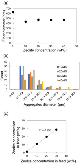 The diameter of the zeolite particles, nanofibers, and aggregates were calculated from the SEM images. The diameter of the zeolite 7H240 particles (12 μm) was larger than that of the EVOH nanofiber (630 nm); thus, the zeolite 7H240 particles covered by the EVOH polymer were fixed within the nanofiber mesh. The diameter of the 7H240 zeolite/EVOH nanofibers was ~450 nm (Figure 3a). The fiber diameter of the zeolite composite nanofiber mesh was successfully maintained between 430 and 470 nm. As the diameter of the zeolite 7H240 particles was ~12 μm, particles in the nanofiber mesh with diameters larger than 20 μm were considered zeolite aggregates. The nanofiber mesh with 40 wt% zeolite exhibited the highest number of >20 μm aggregates (Figure 3b). To avoid these large aggregates, only nanofiber meshes with 0 to 30 wt% zeolite were investigated further.