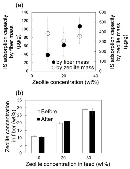 The IS adsorption of the 7H240 zeolite/EVOH nanofiber mesh increased with the increasing zeolite concentration (Figure 4a), which indicated that IS adsorption was attributed to the zeolite component of the composite mesh. The white circle in Figure 4a shows the IS adsorption capacity of zeolite 7H240 by zeolite mass. The IS adsorption capacity of zeolite 7H240 was relatively unaffected by concentration and doubled to ~350 μg/g in the nanofiber mesh compared to the original 7H240 (208 μg/g) (Figure 1a).