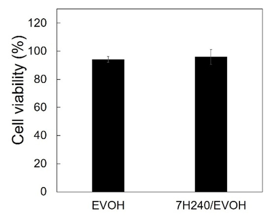 The relative cytotoxicity of the EVOH nanofiber mesh and 7H240 zeolite/EVOH nanofiber mesh in Raw 264.7 cells after incubation at 37 °C for 24 h (n = 6).