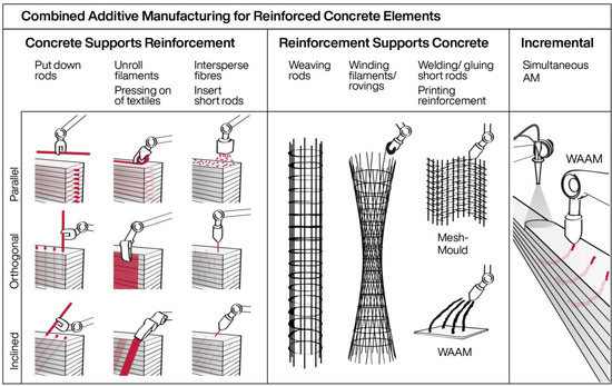 Although these approaches to integrating reinforcement into the additive manufacturing process vary widely, a classification of reinforcement can be used based on its functionality during the additive manufacturing process. This classification approach groups reinforcement into three categories: firstly, “concrete supports reinforcement” (CSR); secondly, the inverse approach, “reinforcement supports concrete” (RSC); and thirdly, incremental processes, where concrete and reinforcement are fabricated almost simultaneously with only a minor time offset. This classification approach is depicted in Figure 1 and described in more detail by Kloft et al. [2].