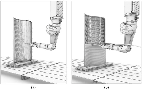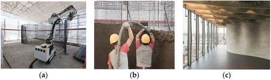 - Taha, N.; Walzer, A.N.; Ruangjun, J.; Lloret-fritschi, E.; Gramazio, F.; Kohler, M. Robotic AeroCrete A Novel Robotic Spraying And Surface Treatment Technology For The Production of Slender Reinforced Concrete Elements. In Proceedings of Architecture in the Age of the 4 Th Industrial Revolution, Porto, Portugal, 11–13 September 2019; pp. 245–254. [Google Scholar]