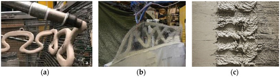 Another approach followed by Block Research Group at ETH Zurich utilizes 3D knitting of technical textiles for fabricating lightweight fabric formworks for thin concrete shell structures [21]. Here, long strips of textiles with integrated pockets for steel cables are knitted on a computer controlled industrial knitting machine. In order for the formwork to stand up and support the fresh concrete, the formwork is tensioned over a support frame before it is subsequently manually covered using a multi-stage shotcrete process. In addition to the use of individualized carbon fiber elements, there are several research projects that use standard carbon fiber mats as a structural stay-in-place formwork system for additive manufacturing processes. One example for “reinforcement supports concrete” is the “SCRIM” approach, where concrete is robotically extruded onto a standard carbon fiber reinforcement mat (see Figure 3a), [22]. A similar technique was developed by Gramazio Kohler Research at ETH Zurich using robotically sprayed concrete. In the AeroCrete project, a follow-up to the Mesh Mould research, a robot-assisted spraying process with fiber-reinforced concrete was investigated in order to produce thin shell constructions (see Figure 3b), [23]. In Figure 3c, differently from the previous projects, a concrete core was 3D printed first, and then a standard mat was pressed into the concrete and covered again with a layer of concrete [24].