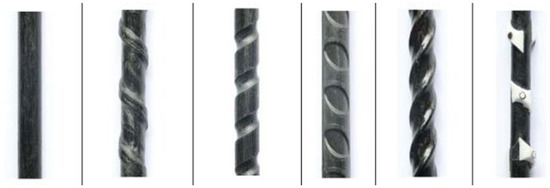 Carbon fiber reinforcing bars with different ribbing for better mechanical bonds in concrete. From left to right: plain bar without surface functionalization, core-winded using tape, contour milled, form-pressed, twisted, and pinned elements [28].