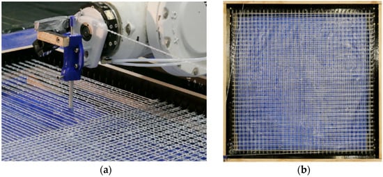Dynamic mesh winding process: (a) robot guiding the core-winded fibers over a frame, generating a dense reinforcement mesh; (b) finished mesh before concrete application.
