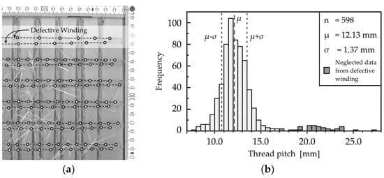 In order to assess the accuracy of the final mesh structure, a section of the winded mesh was cut out for optical measurement via a non-distortive two-dimensional 600 dpi scan. By means of computer aided drawing, points were placed wherever the secondary yarn crosses the apparent mid of the roving. The distances between those points were computed automatically and calibrate (see Figure 14). The uncertainty of this method is conservatively assumed to be below ±1 mm per point, thus resulting in a twofold uncertainty per distance. Two fiber strands in the scanned cut-out exhibit almost double of the desired thread pinch. Those particular deviations may have arisen from an exceeded acceleration limit as mentioned before. When neglecting this data, the overall arithmetic mean lies at 12.13 mm at the peak of a Gaussian-shaped distribution. Based on the assumption of a normal distribution, the standard deviation was calculated to be ±1.37 mm. It is situated in the order of magnitude of the assumed measurement error. Consequently, deviations cannot clearly be traced back to deviations from the process itself. Even if those deviations came exclusively from the dynamic winding, it would still represent a satisfying result. Having a shortening or elongation of the helix of less than 11% for the majority of the wound fibers is not expected to affect the compound-strengthening effect of the helix at all.
