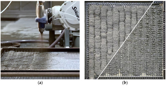 After 24 h, the meshes were fully cured and the first shotcrete 3D printing process experiments were carried out. In these first trials, the main focus was to determine if the mesh size was chosen appropriately for the shotcrete application, or if it needs to be adjusted for subsequent trials. For this purpose, the meshes were left in their horizontal position. The winding toolhead was dismounted and replaced with the Shotcrete 3D Printing toolhead. A ready-mixed fiber-reinforced fine-grain concrete with a maximum grain size of 2 mm and a compressive strength of 68 MPa was used for spraying [33]. The material was projected onto the mesh at a distance of 30 cm with an air pressure of 1.5 bar (see Figure 15a); no shotcrete accelerator was used. The shotcrete easily penetrated through the structure, such that a satisfactory bond would be expected (see Figure 15b). In order to produce structural elements with high surface quality, the application of shotcrete application from the other side of the mesh, as well as an automated surface finishing, as described in [34], is planned. The application of concrete took 4 min. Due to the horizontal position and the self-weight of the concrete, a slight deflection of 2.5 cm occurred.